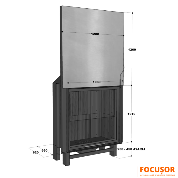 🪟 Vizibilitate extinsă: geam frontal înalt, pentru o priveliște amplă a flăcării